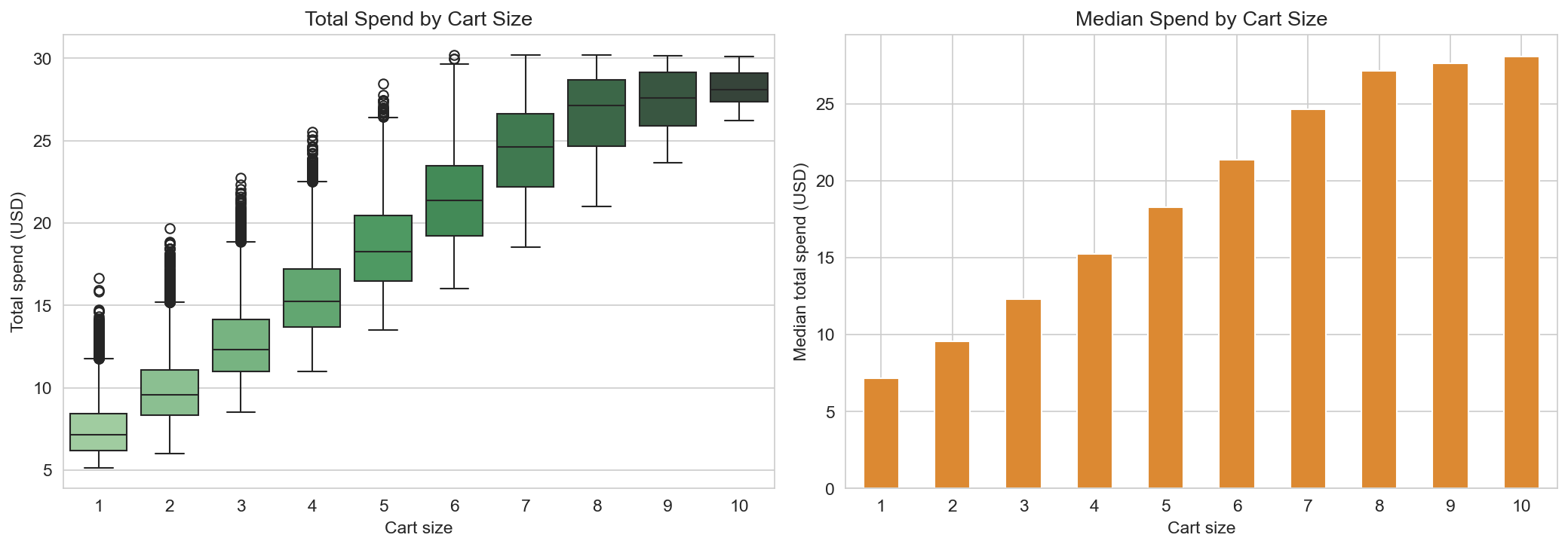Cart size is a strong predictor of total spend: median spend rises with the number of items. The box plot and median-by-cart-size chart show a clear step-up as cart size increases. Customizations (e.g. extra shot, alternative milk) add variability; orders with more customizations tend to sit in the same or slightly higher spend bands. Food attachment matters too: about 32% of orders include at least one food item, and those orders have higher median spend than drinks-only orders. So basket size, customization, and food are all associated with higher check sizes.