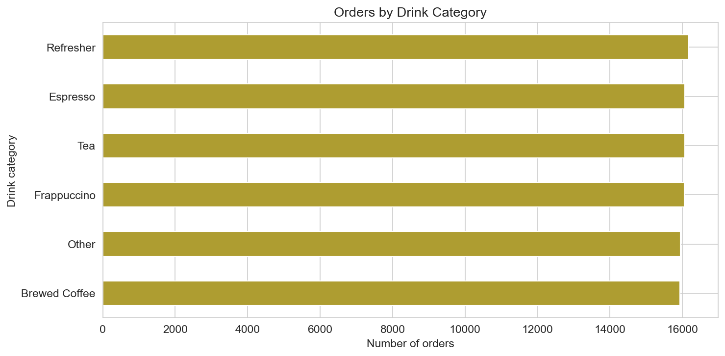- Drink categories: Refreshers, Brewed Coffee, Frappuccino, Espresso, Tea, and Other all appear; Refreshers lead in order count in this sample.