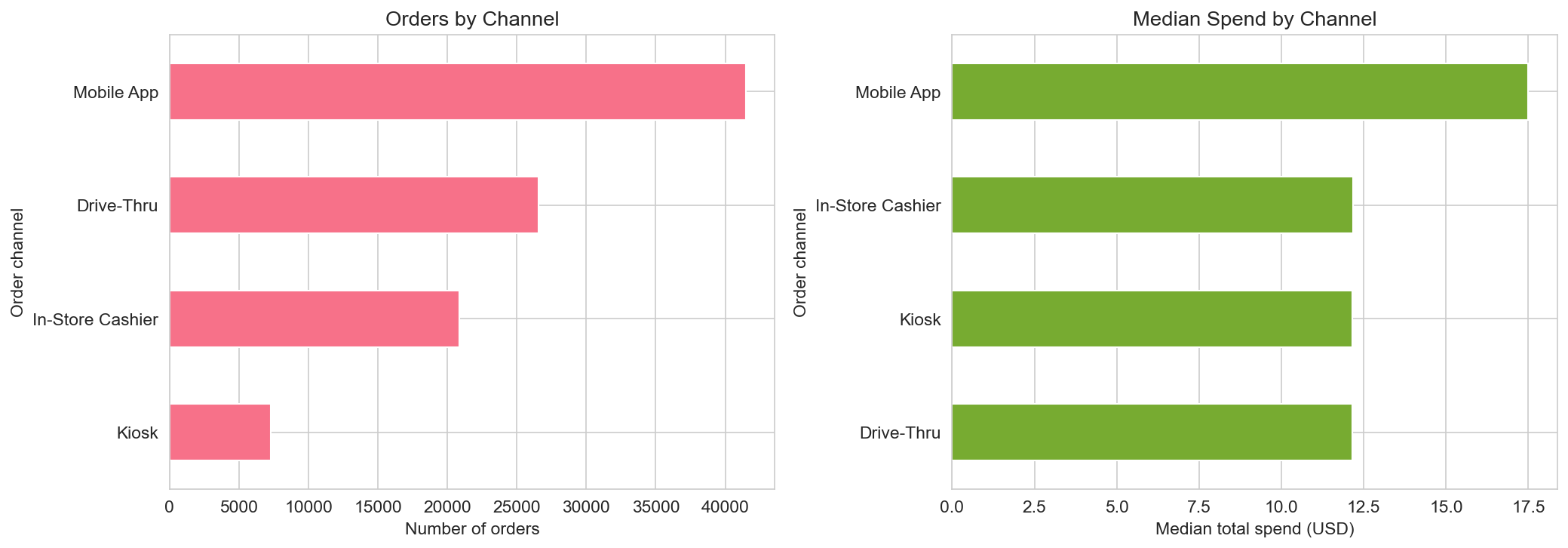- Order channels: Mobile App dominates by volume, followed by Drive-Thru, In-Store Cashier, and Kiosk.