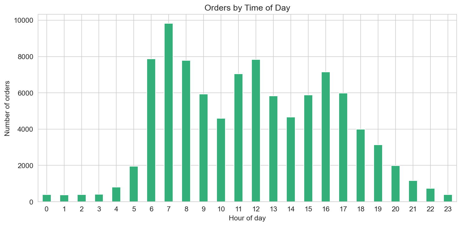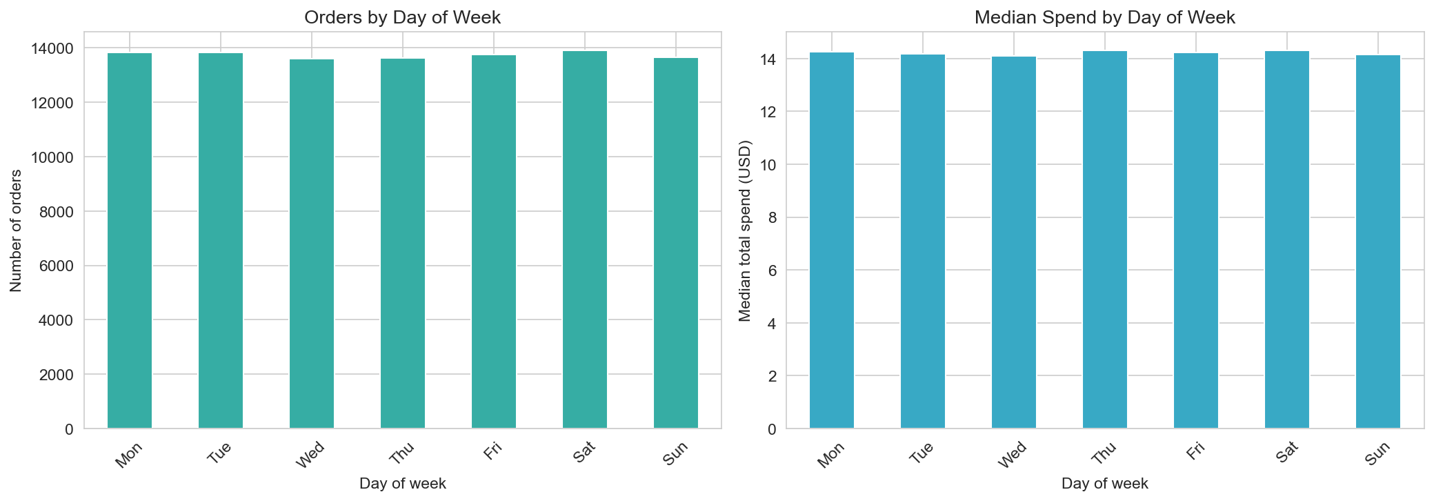Time of day peaks in the morning (roughly 6–9 a.m.) and again in the mid-morning and lunch hours, with a long tail through afternoon and early evening. Day of week shows weekday versus weekend patterns: weekend days can show different order counts and median spend, reflecting leisure versus commute behavior. Together, these views describe when demand is highest and how basket size varies by time.