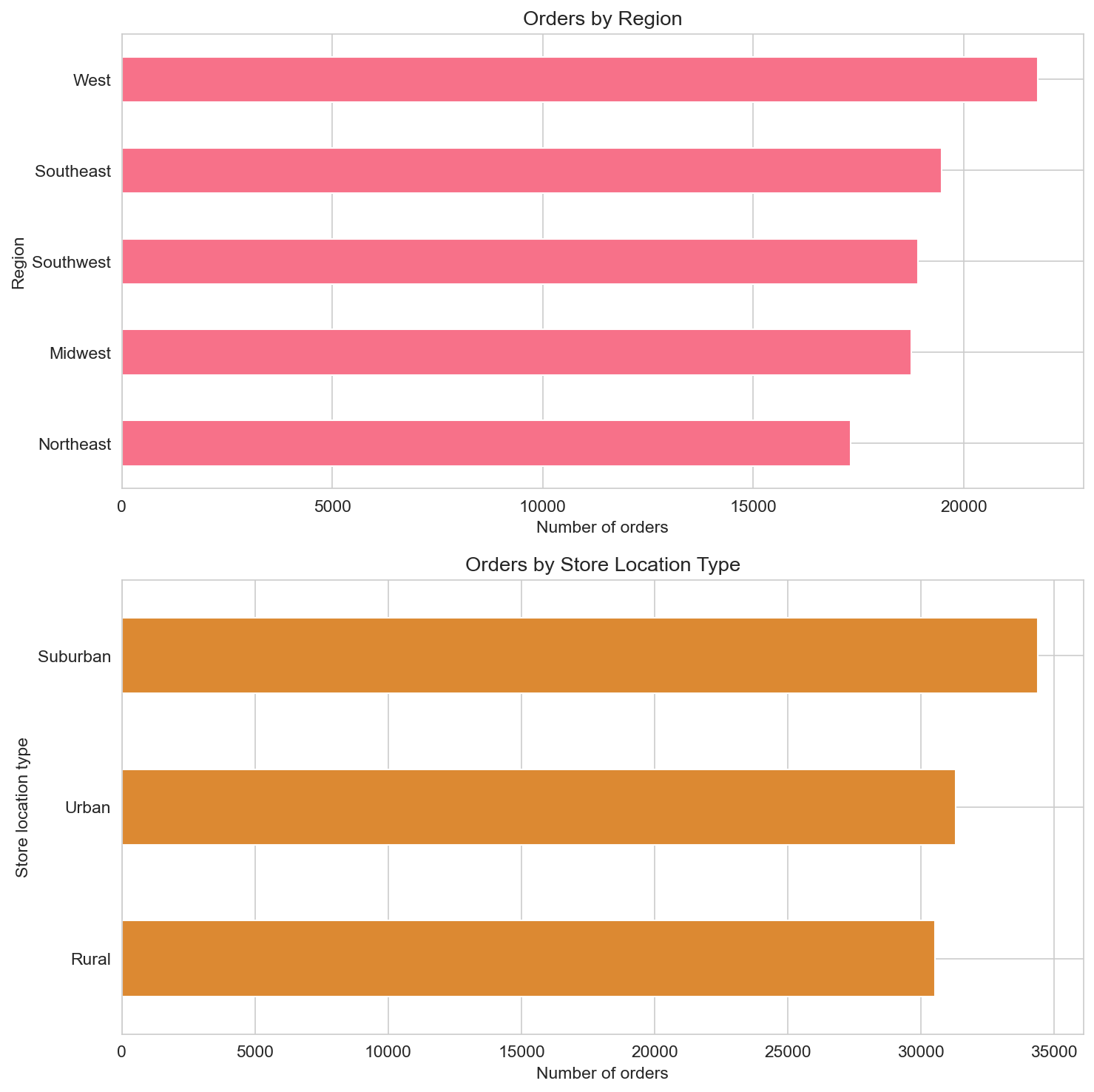 Order channel splits orders into Mobile App, Drive-Thru, In-Store Cashier, and Kiosk. The Mobile App accounts for the largest share of orders (about 41,000 in the cleaned sample), followed by Drive-Thru. Median spend differs by channel: app and kiosk orders tend to have slightly higher median spend than some in-person channels, consistent with larger or more customized baskets when ordering ahead or self-serving. Region and store location type (Urban, Suburban, Rural) show clear geographic spread: orders are distributed across regions, with Urban and Suburban stores contributing the bulk of volume. So “how” and “where” both matter for both volume and basket size.