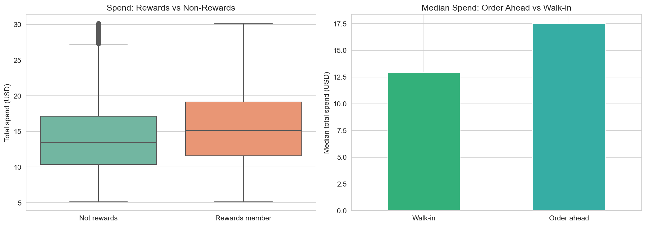 - Rewards members and order-ahead users show higher median spend; loyalty and app adoption align with revenue.