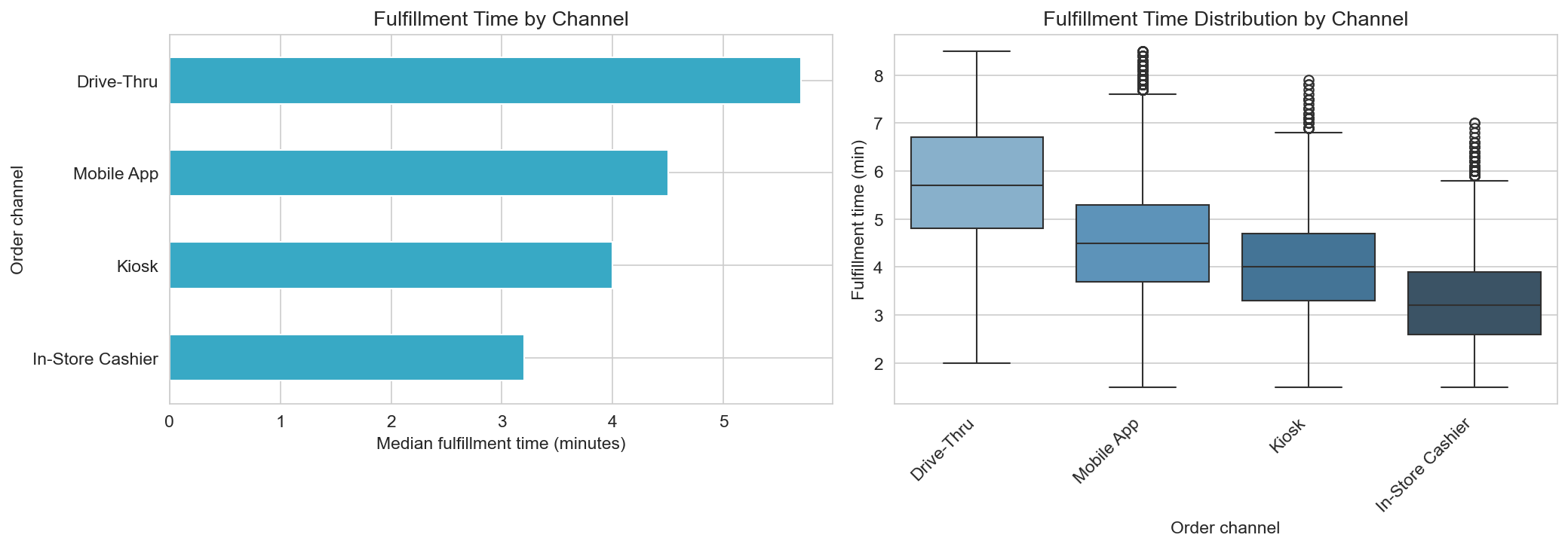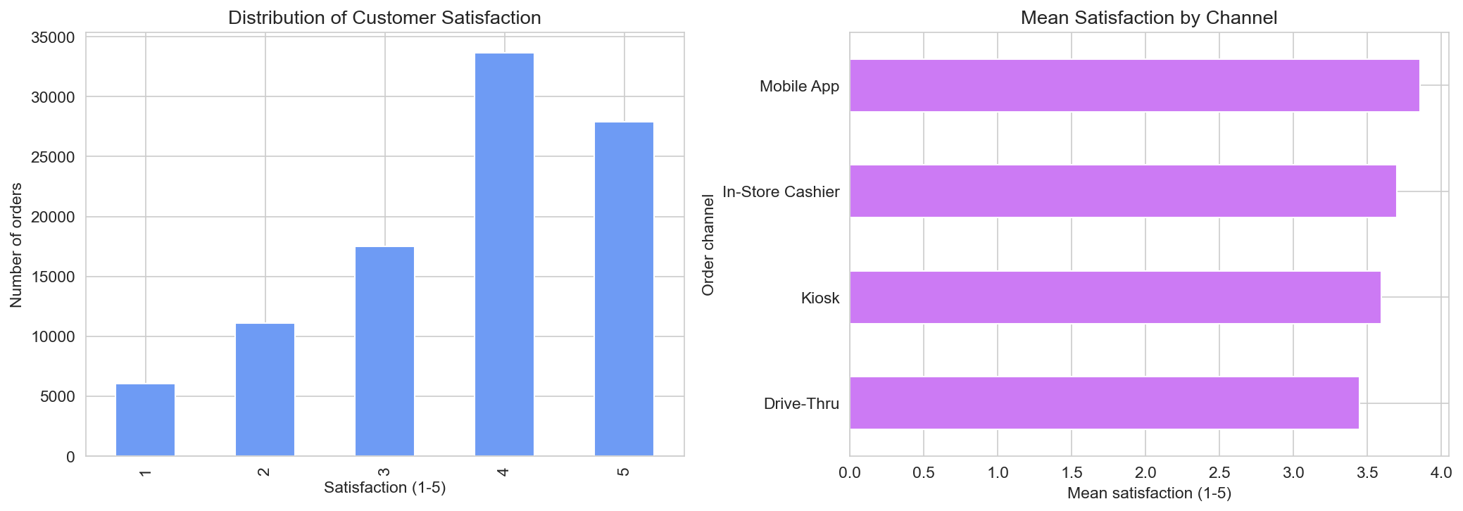 Fulfillment time (minutes from order to handoff) varies by order channel: Drive-Thru and In-Store can show different median times than Mobile App pickup or Kiosk, depending on store layout and queue management. The box plot of fulfillment time by channel highlights which channels are fastest on average and where variance is highest. Customer satisfaction (1–5) has a right-skewed distribution (many 4s and 5s). Mean satisfaction differs by channel: some channels (e.g. Mobile App, Kiosk) may show slightly higher mean satisfaction, possibly reflecting convenience or reduced wait perception. Fulfillment time and satisfaction are related: longer waits tend to associate with lower ratings, so speed and consistency matter for perceived quality.