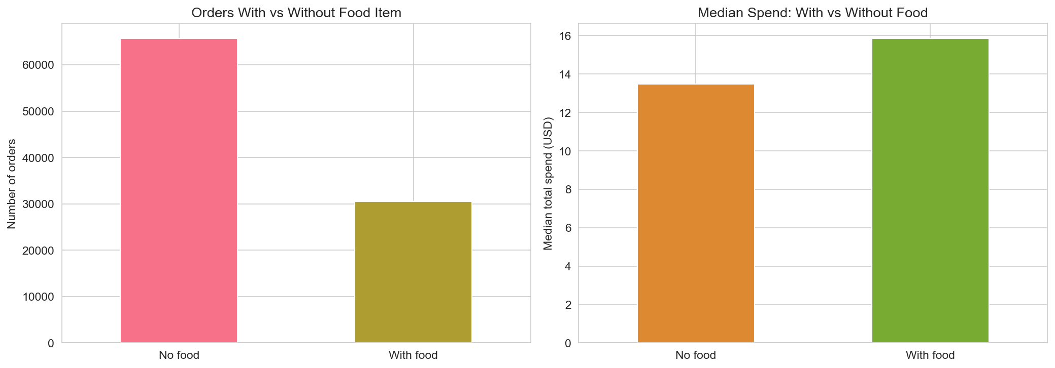 About 32% of orders include at least one food item (has_food_item). Orders with food have higher median spend than drinks-only orders, as expected. The split (with vs without food) and the median-spend comparison show that food is a meaningful driver of basket size and that a sizable minority of visits are “food + drink” occasions.
