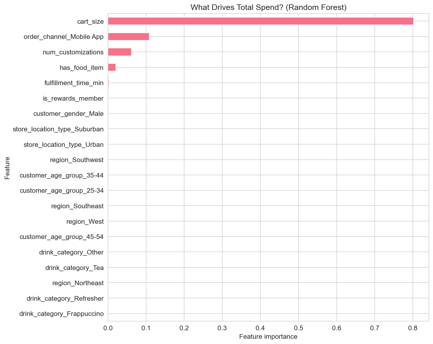 We modeled total spend using a Random Forest with features: order channel, store location type, region, customer age group, gender, drink category, cart size, number of customizations, fulfillment time, rewards membership, food item, and order-ahead. The model explains about 97% of the variance in out-of-sample spend (R² ≈ 0.97 on the test set), so spend is highly predictable from these variables in this sample.