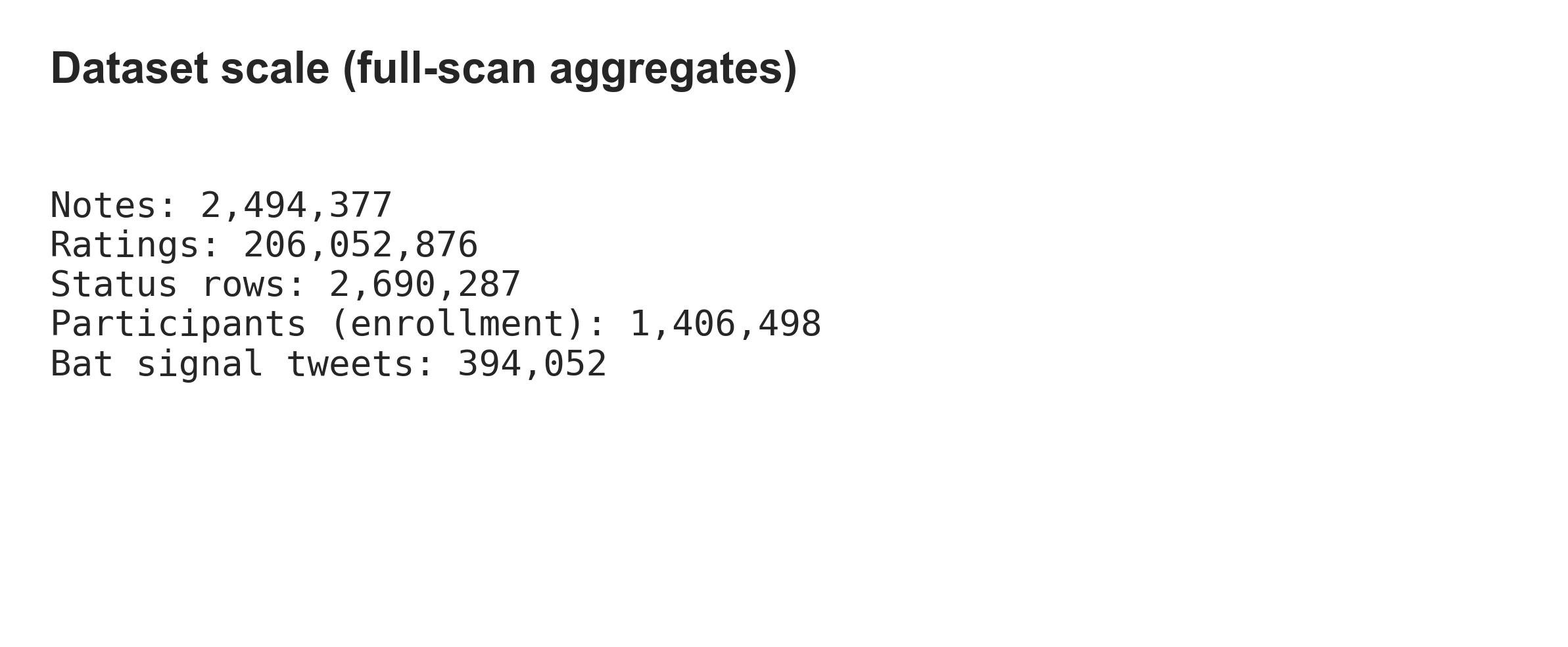 metadata.json); ratings shards dominate. - Bat signals: Counts are row-level; no tweet-level deduplication is applied, so unique tweet cardinality is not stated.