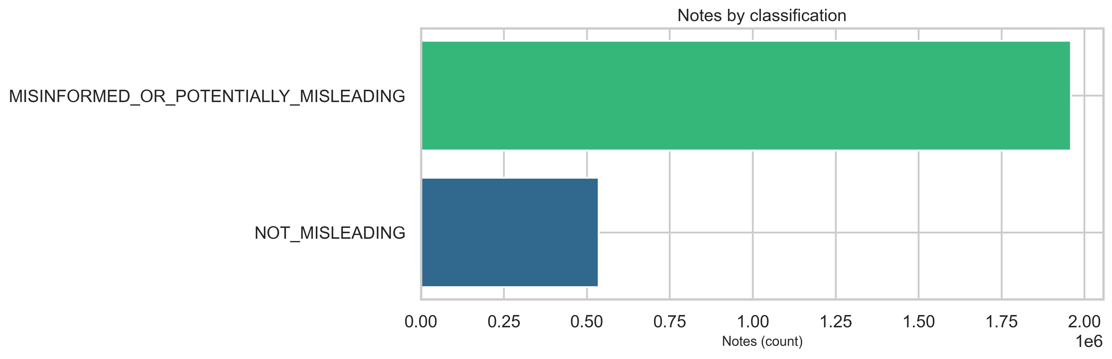 At the classification level, MISINFORMED_OR_POTENTIALLY_MISLEADING notes dominate the labeled set relative to NOT_MISLEADING in this export (see chart below)—about 78.5% (~1.96M) misleading vs 21.5% (~536K) not misleading. The overall ratings-to-notes ratio is ~82× (206M ratings for 2.5M notes). At the rating level, the helpfulnessLevel field carries most of the signal—HELPFUL and NOT_HELPFUL account for the vast majority of rows—while legacy agree / helpful binary columns are sparse in this extract (detailed in Ratings and helpfulness).