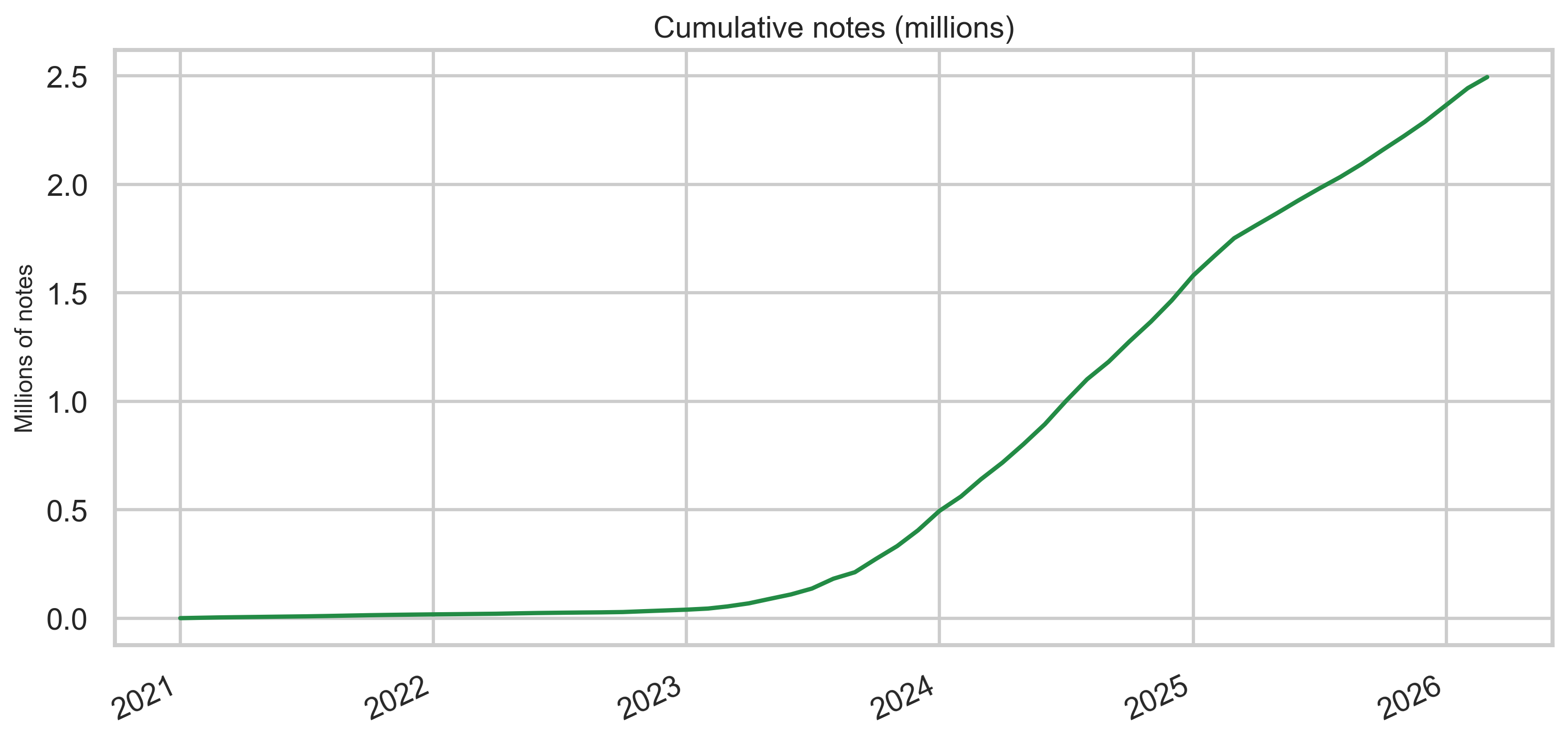 Monthly new-note volume rises sharply in the early years and remains high through the export window, with cumulative growth reaching millions of unique note rows in this snapshot.