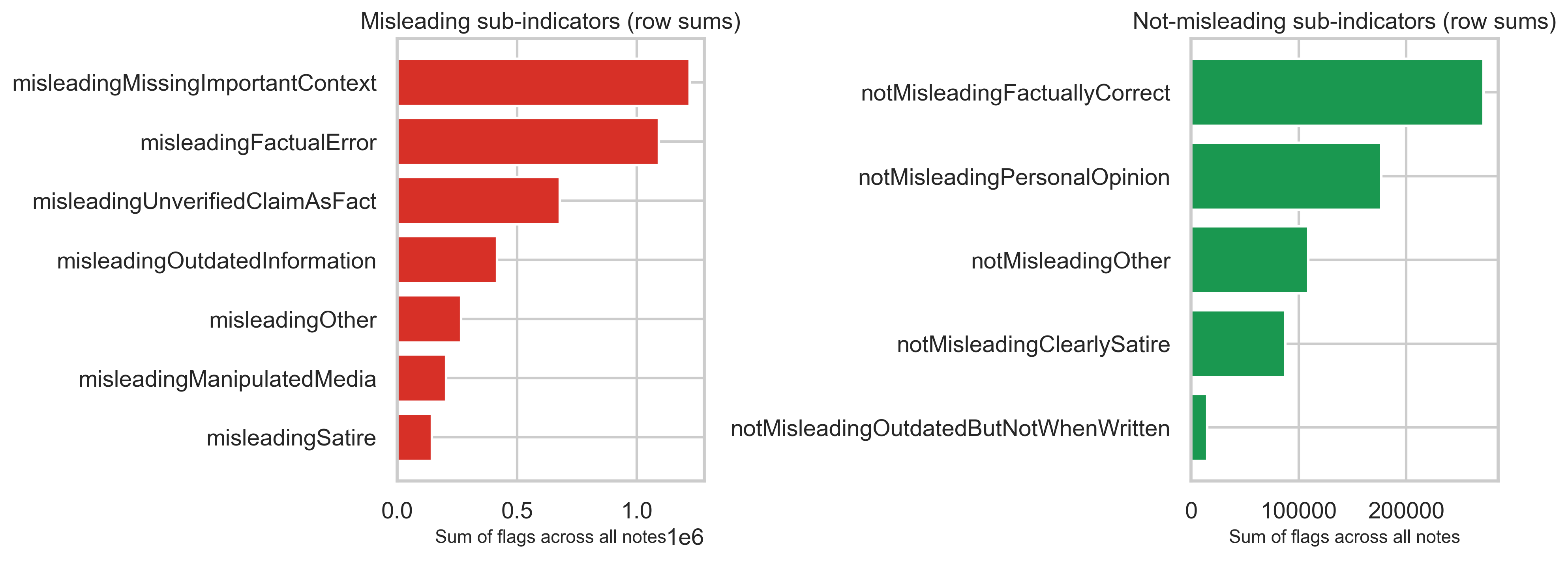 Separate boolean-style columns capture why a note was judged misleading or not. Summing those flags across all note rows shows which reasons appear most often in the structured fields (not mutually exclusive per row).