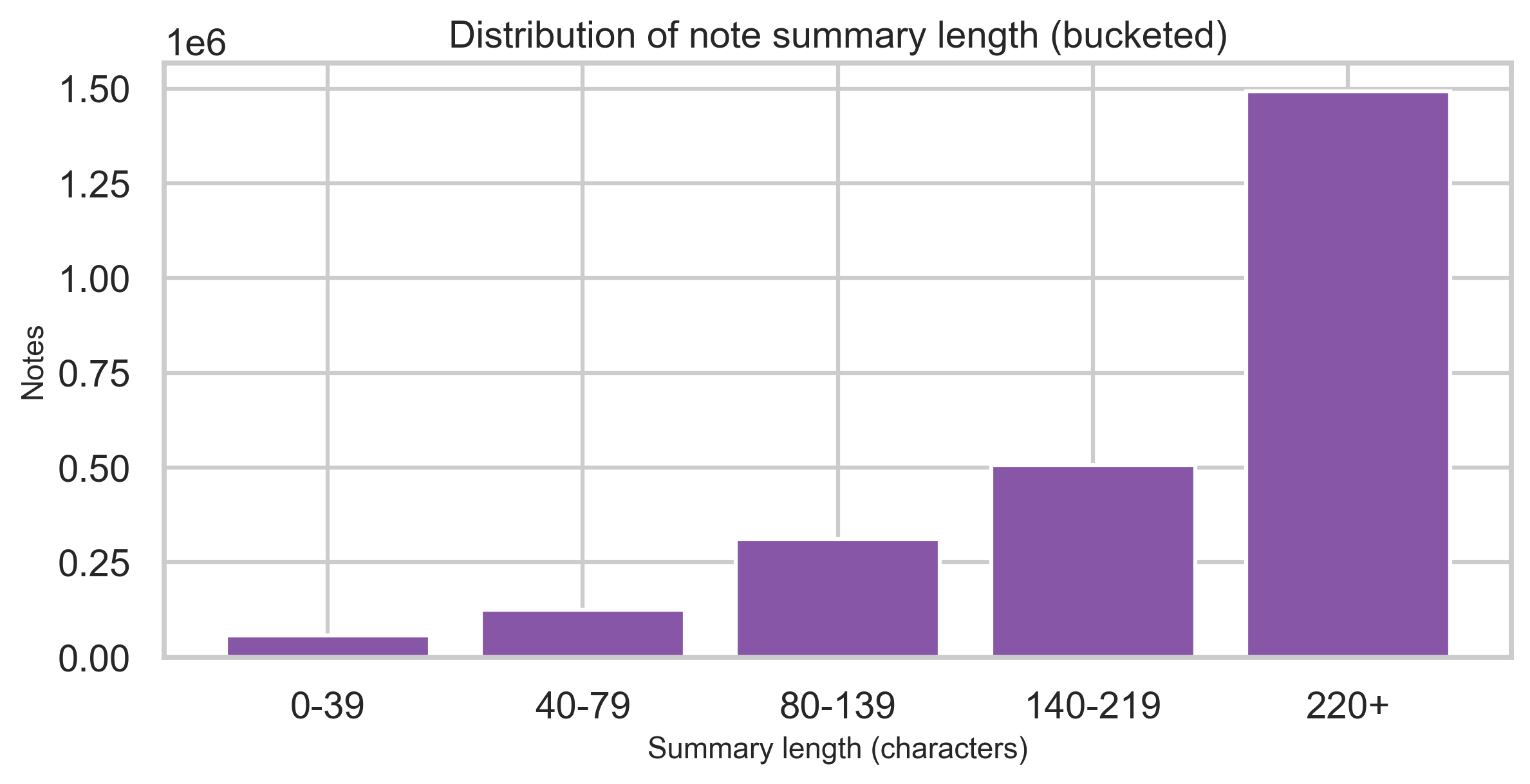 Bucketed character counts of the summary field show where most notes sit in terms of length (without exposing text).