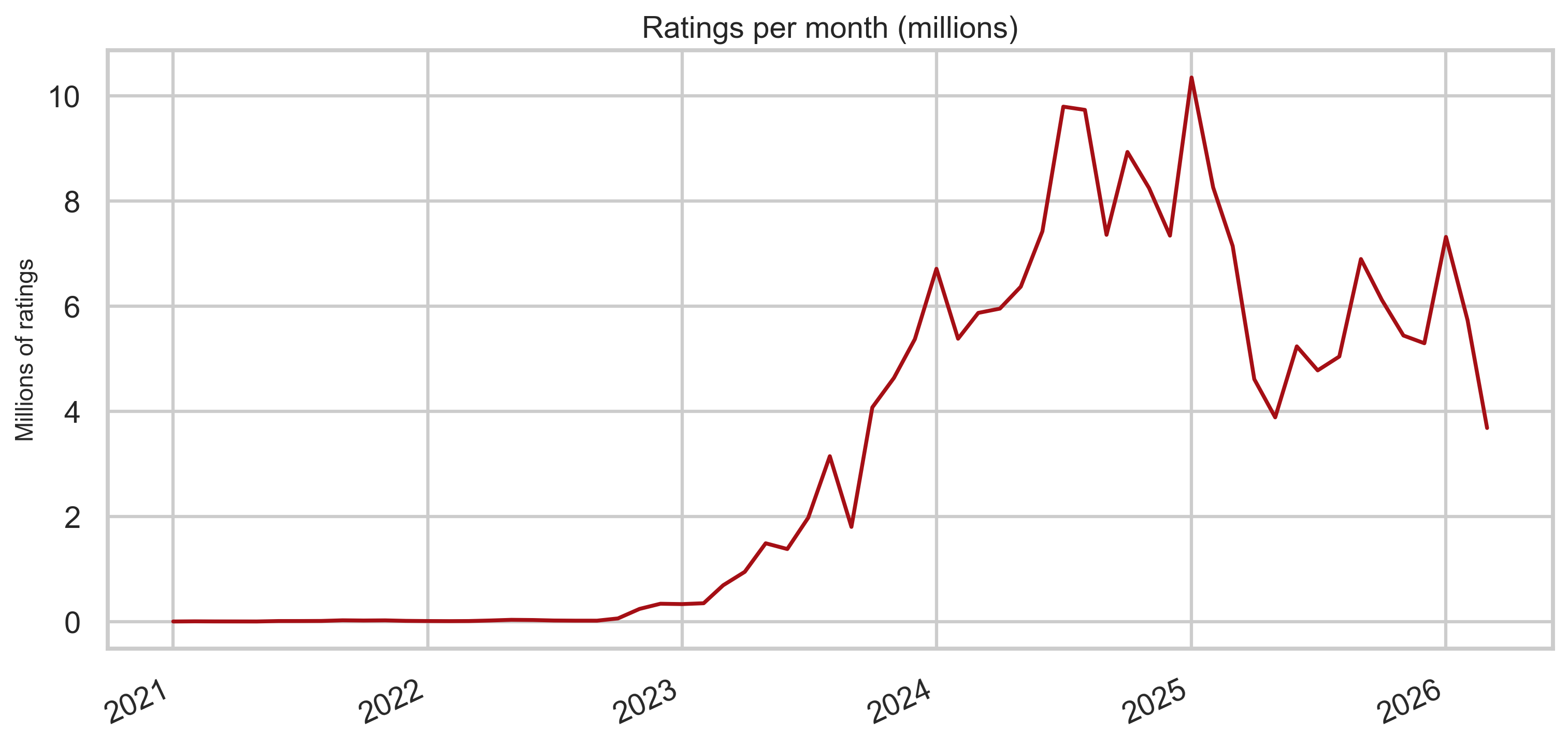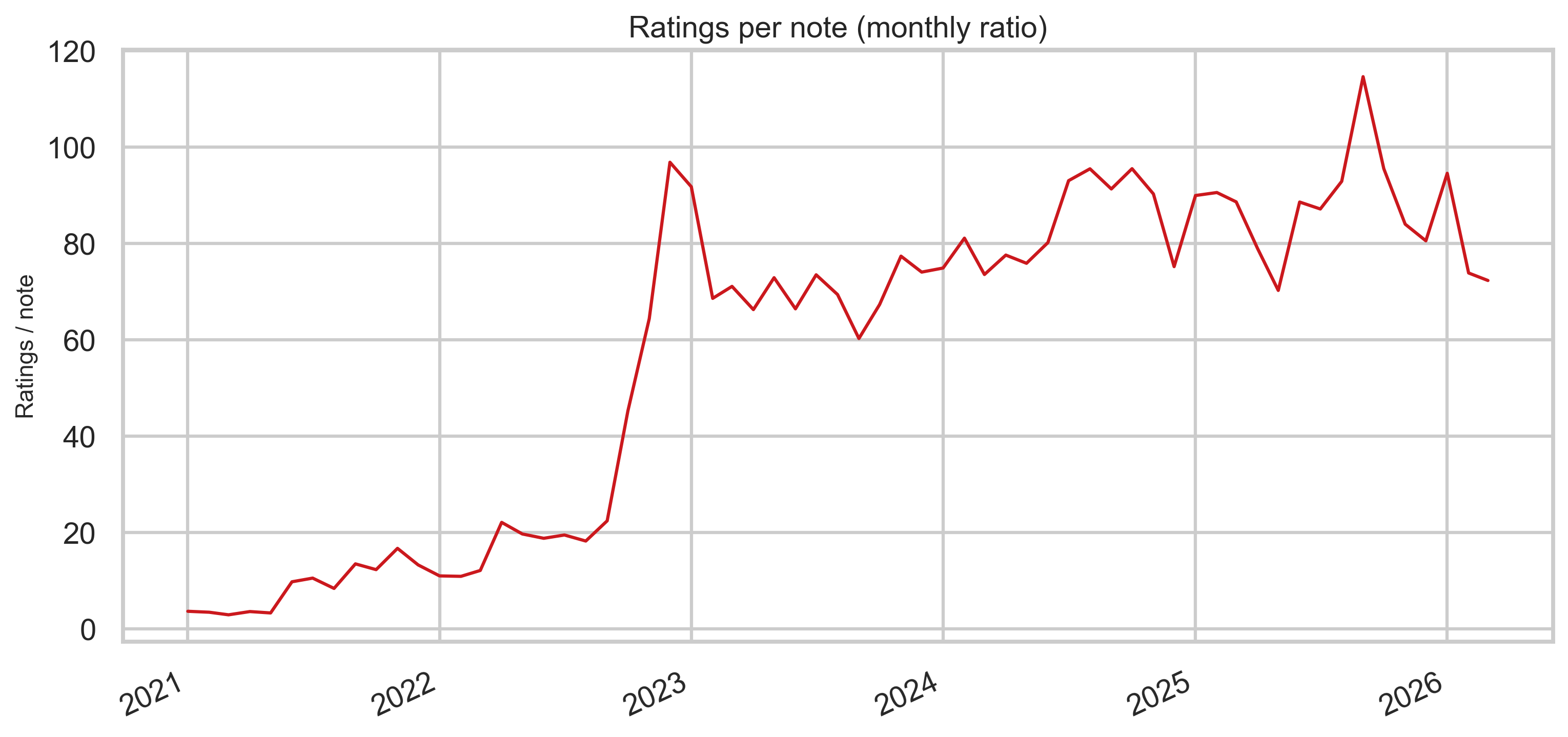 Dividing monthly rating rows by monthly note rows gives a rough intensity measure: how “thick” the rating stream is relative to new notes each month (not identical to “ratings per note” at the tweet level, but useful for comparing eras).