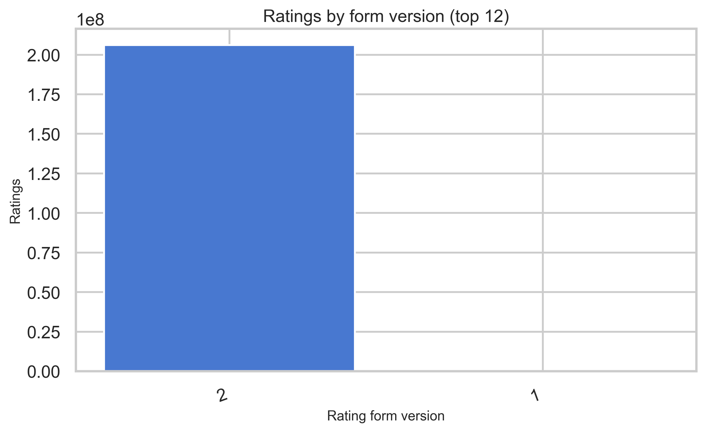 Rating version strings shift over time as forms evolve; ratingSourceBucketed describes where the rating was submitted.