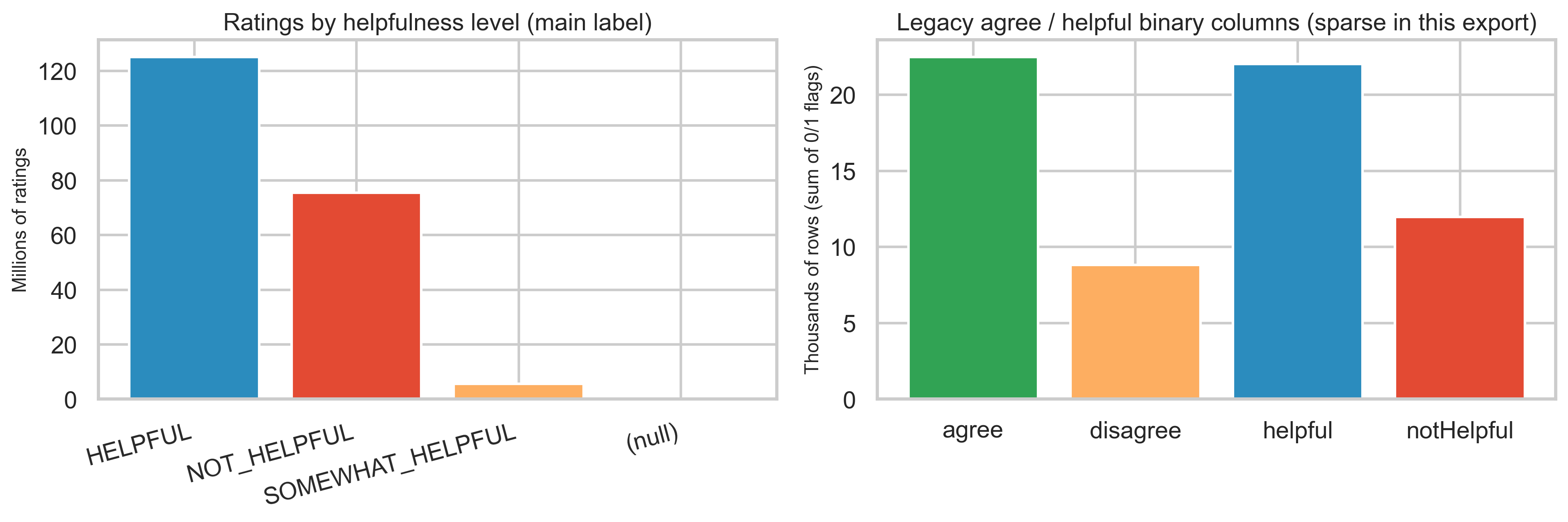 In this export, helpfulnessLevel is populated for almost all rating rows (HELPFUL, NOT_HELPFUL, SOMEWHAT_HELPFUL). By contrast, the older agree / disagree / helpful / notHelpful binary columns have very few positive entries—only ~22K each for agree and helpful out of 206M rating rows—so descriptive work should lean on helpfulnessLevel and the detailed sub-dimension flags.