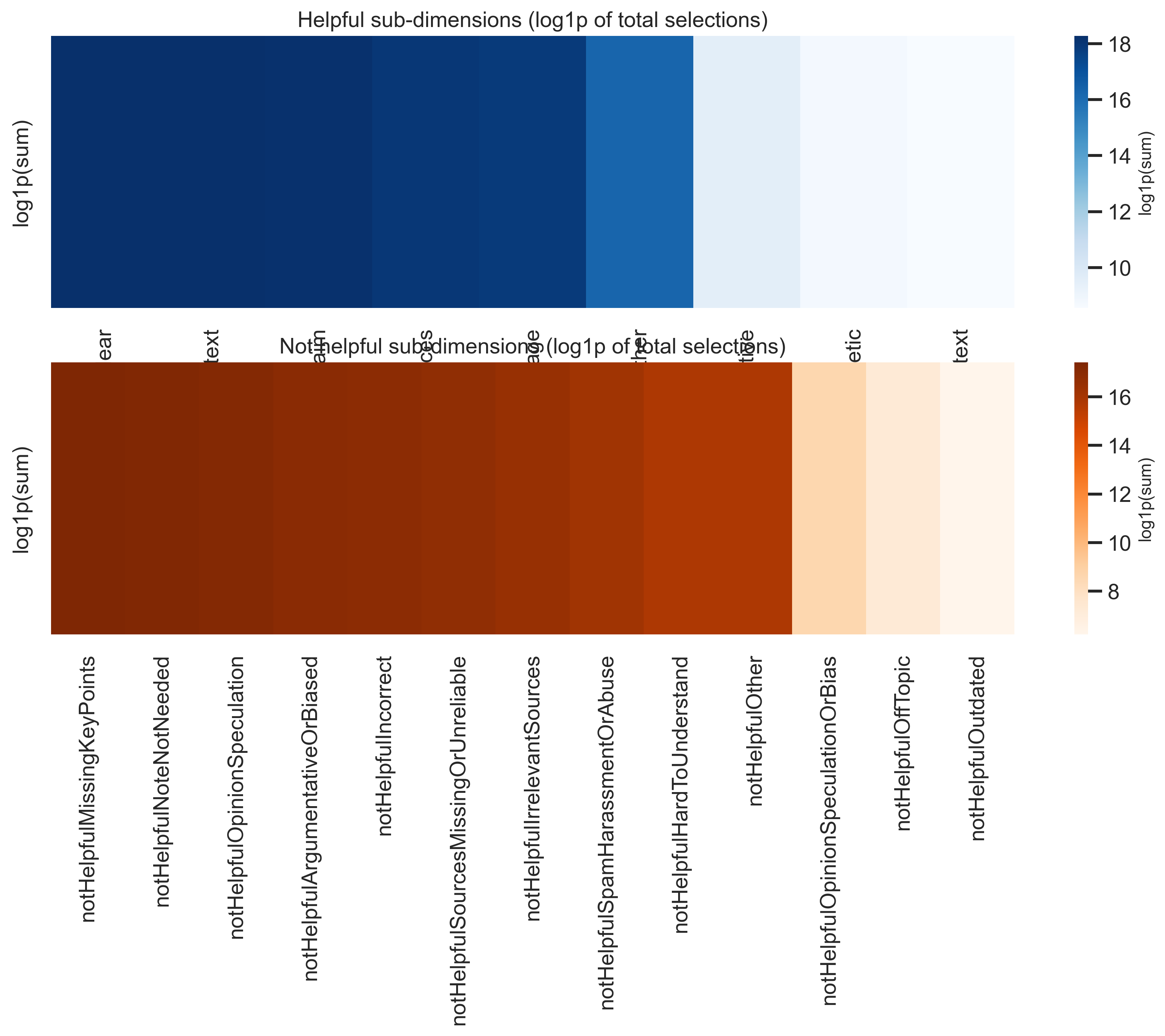 Finer “why helpful / why not” categories are aggregated with log1p scaling in the heatmaps so large totals remain comparable visually.