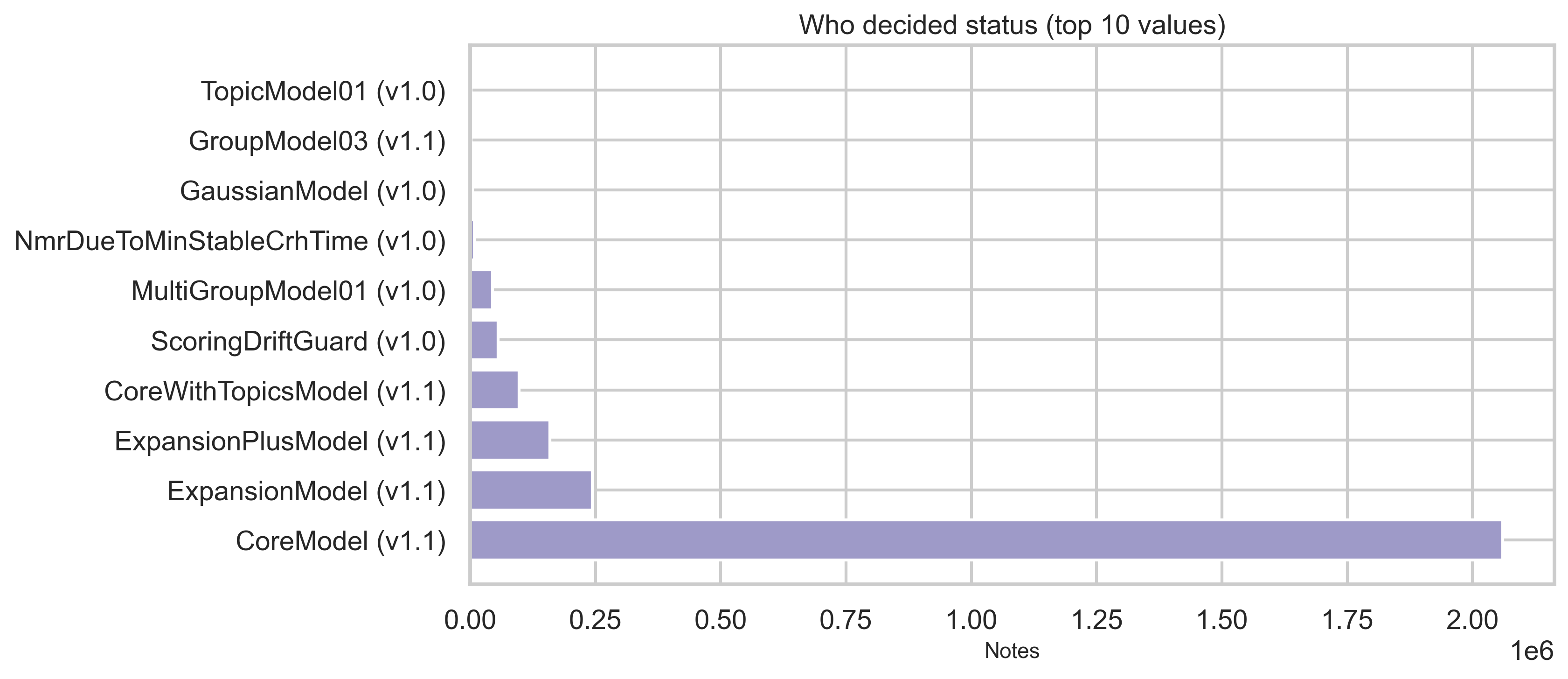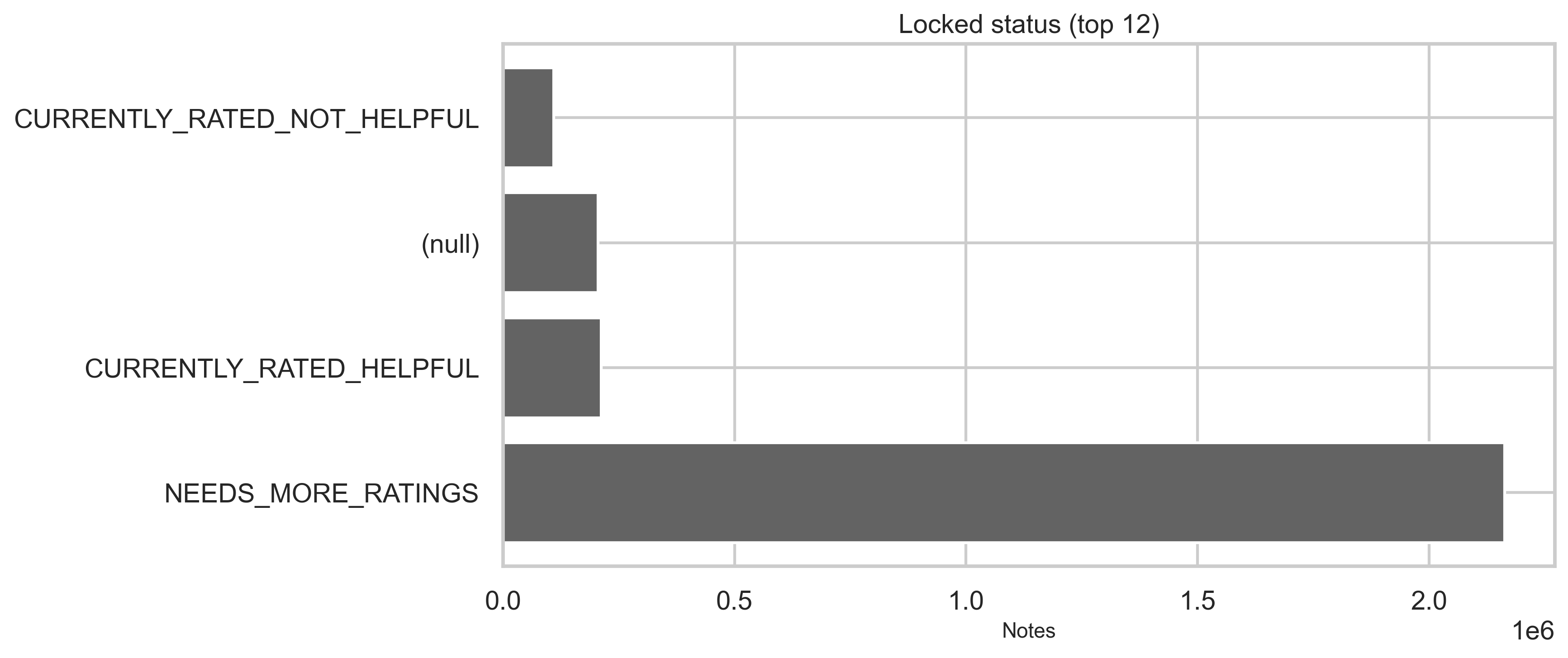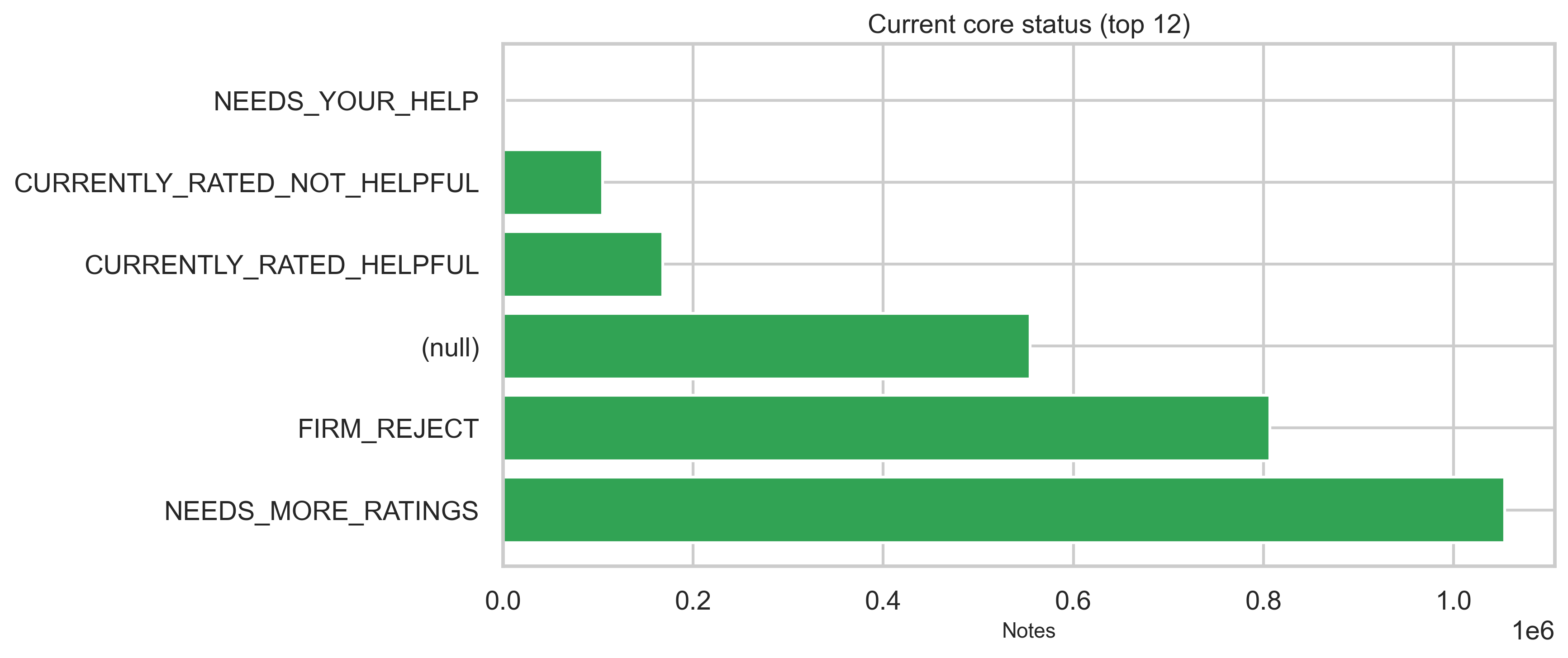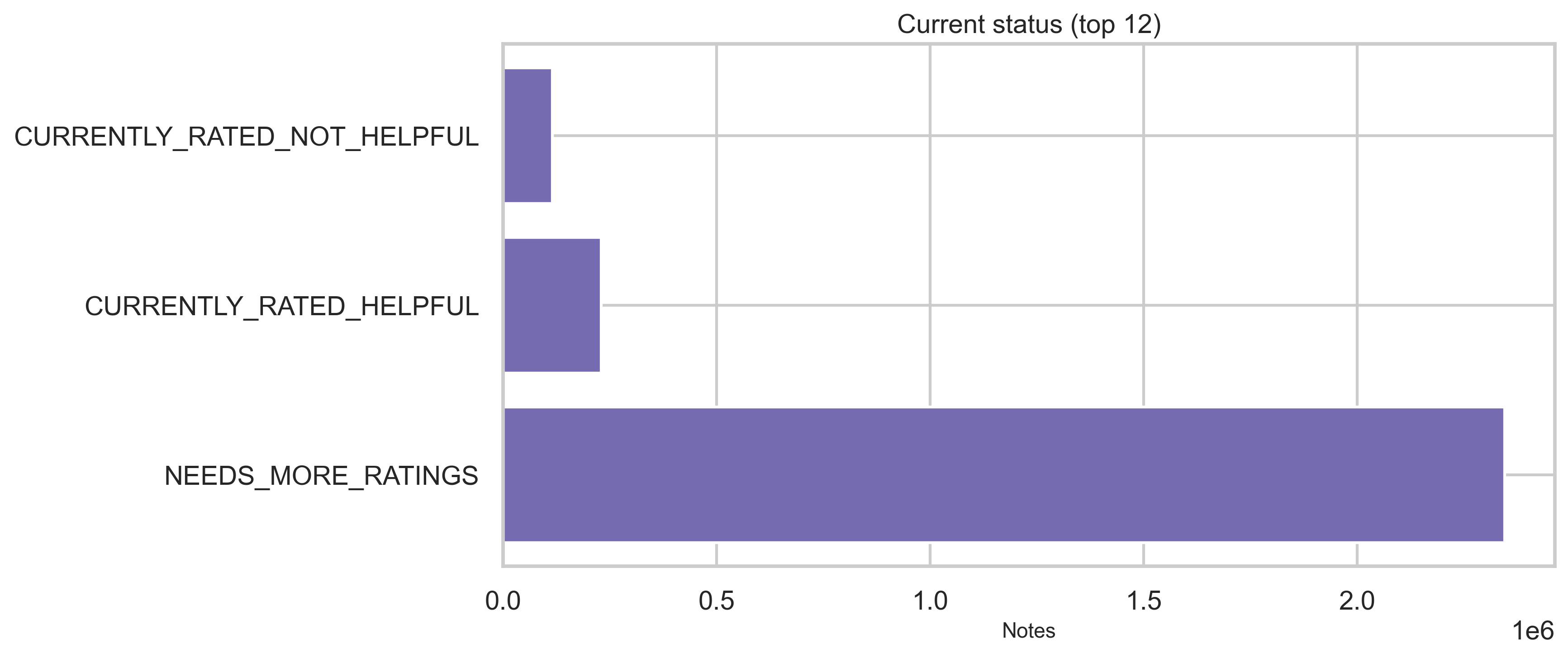 Status tables provide current, locked, and core status dimensions plus who decided the status in modeled flows. Top categories are shown below (full distributions are in out/*.csv). The vast majority of status rows are NEEDS_MORE_RATINGS (~2.35M); CURRENTLY_RATED_HELPFUL and CURRENTLY_RATED_NOT_HELPFUL each sit in the hundreds of thousands.