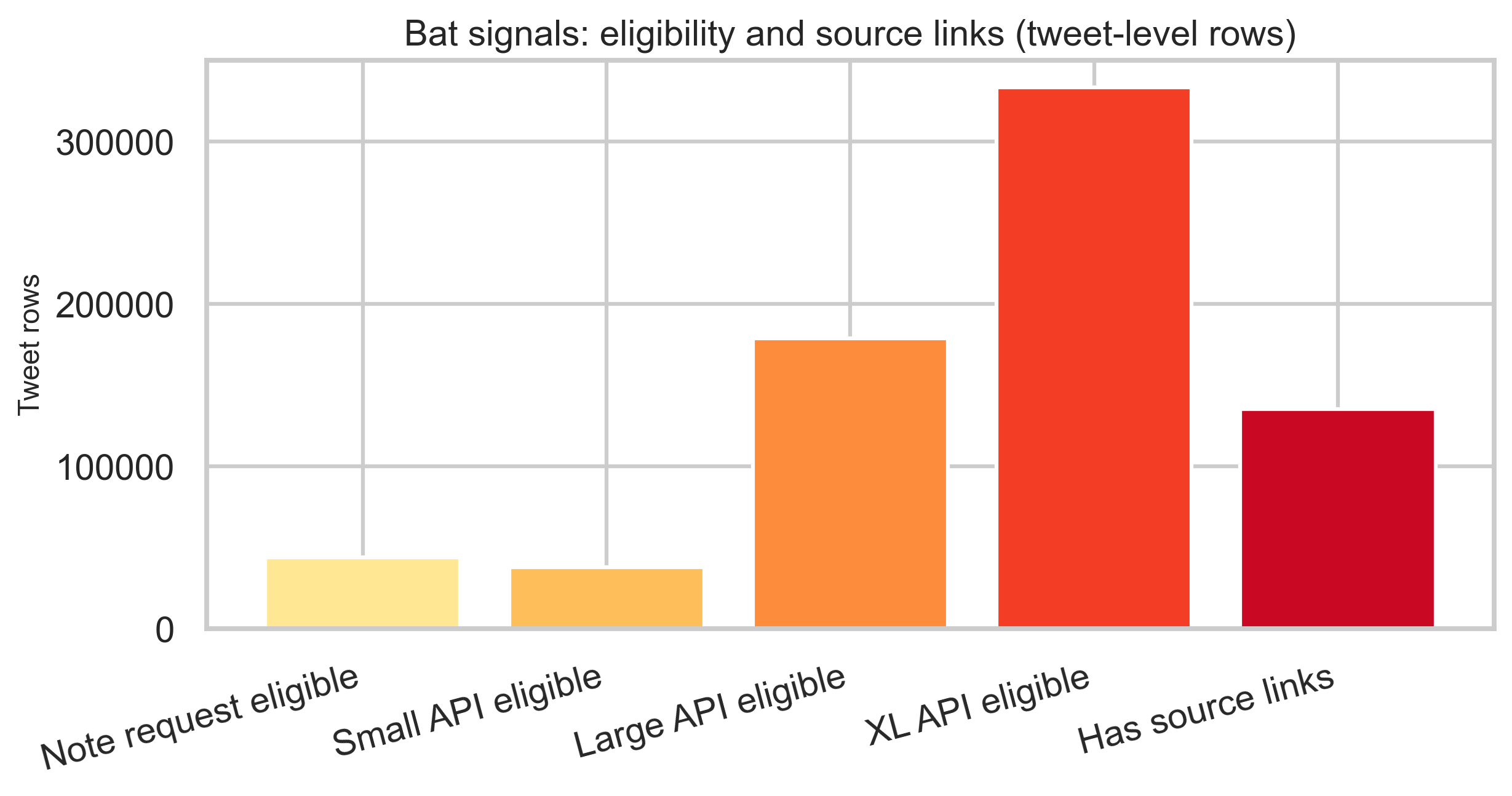 Bat signal rows are tweet-level: several timestamp columns describe eligibility for note requests and API feed tiers, plus optional source links. Counts below are row-level, not unique-global tweet cardinality.