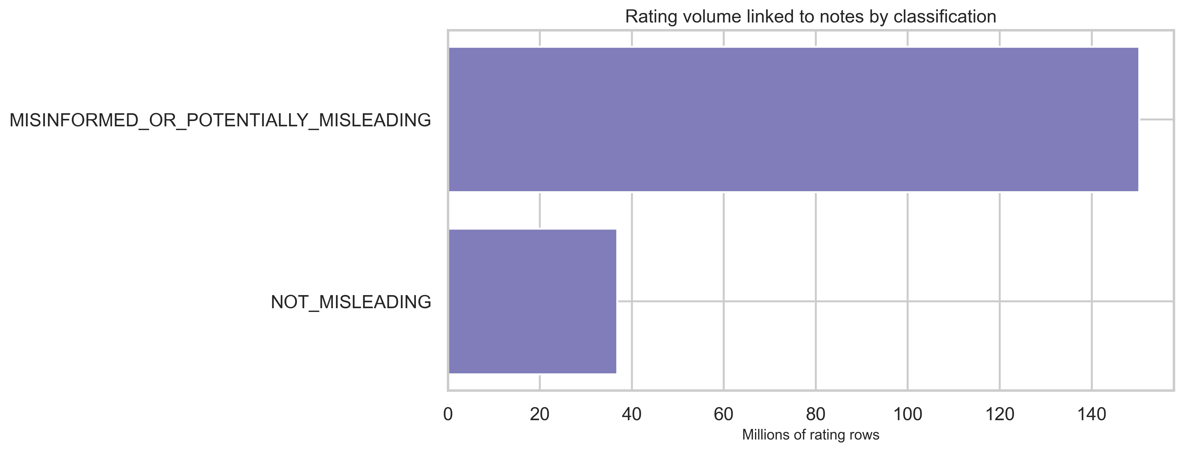 Joining ratings to notes on noteId lets us compare how HELPFUL vs NOT_HELPFUL ratings distribute for notes tagged misleading versus not misleading at the classification level—again at aggregate scale only. Misleading notes receive both more ratings and a different mix: ~93M HELPFUL vs ~52M NOT_HELPFUL for misleading, vs ~21M HELPFUL vs ~14.5M NOT_HELPFUL for not-misleading.