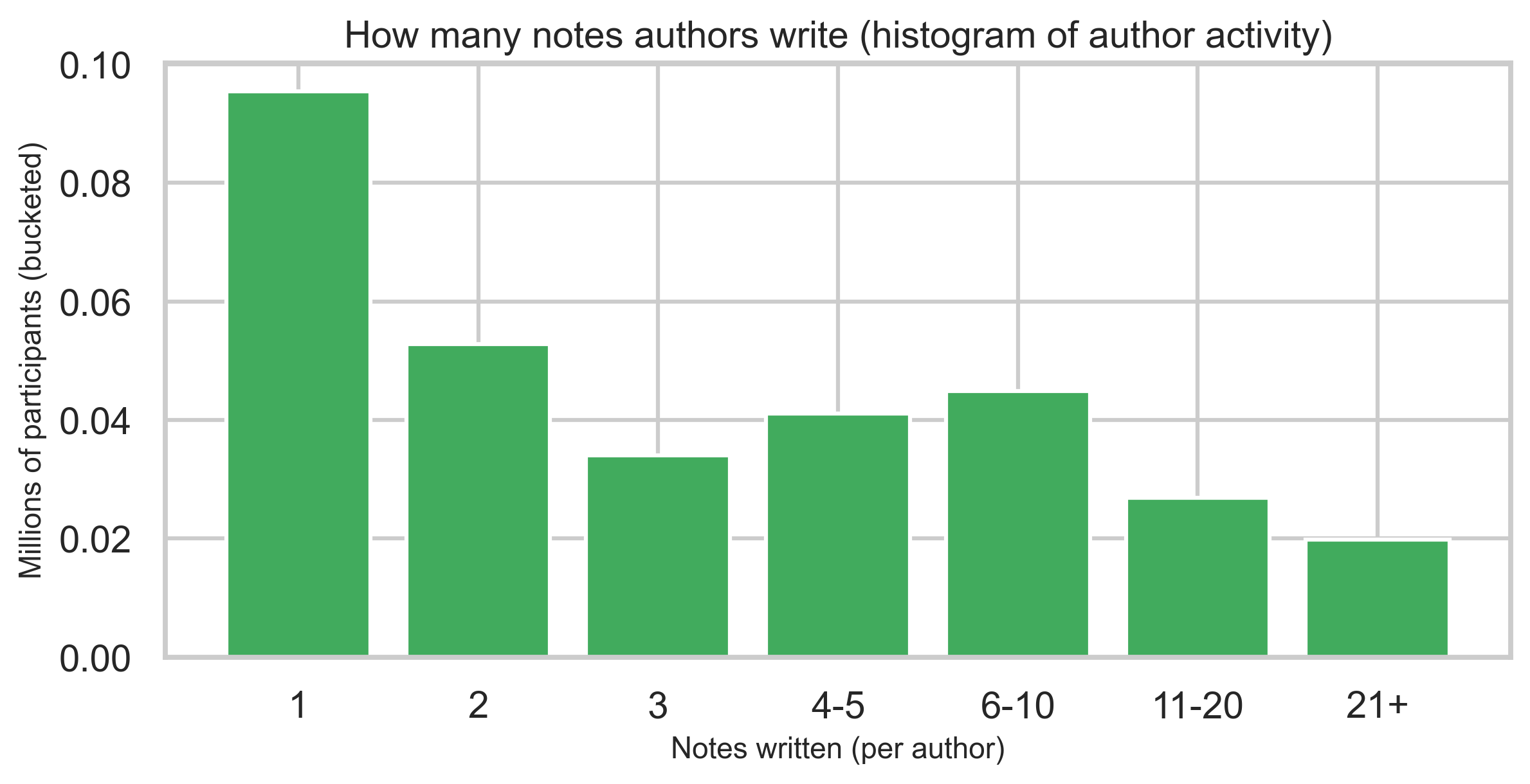 A binned histogram of how many notes each author has written shows heavy concentration among one-note contributors and a long tail of highly active authors—reported as bins, not identities.
